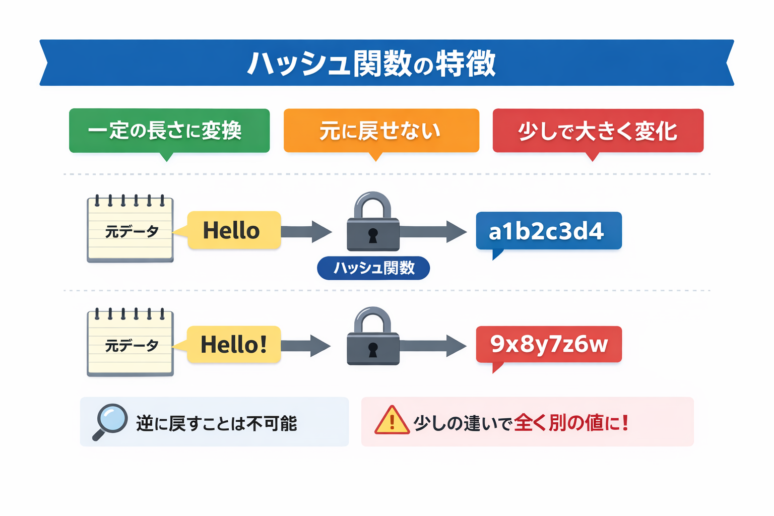 ハッシュ関数とは、データを一定の長さの値に変換する仕組みであり、この値から元のデータを逆算することは極めて困難です。また、データを少しでも変更すると、全く異なる値になる特徴があります。
