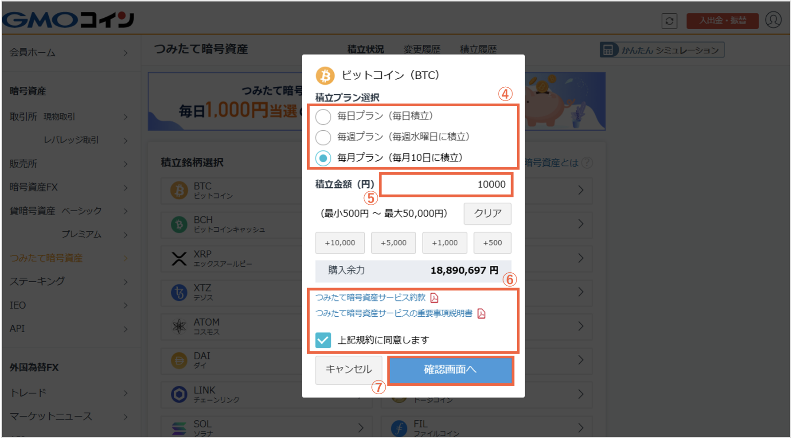- つみたて暗号資産のサービス約款および重要事項説明書を確認し、同意にチェック