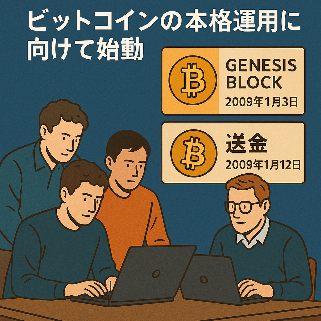 そして、約2ヶ月後の2009年1月3日、ビットコイン最初のブロックが作られ、その1週間後の2009年1月12日には、ビットコインの初送金が行われました。