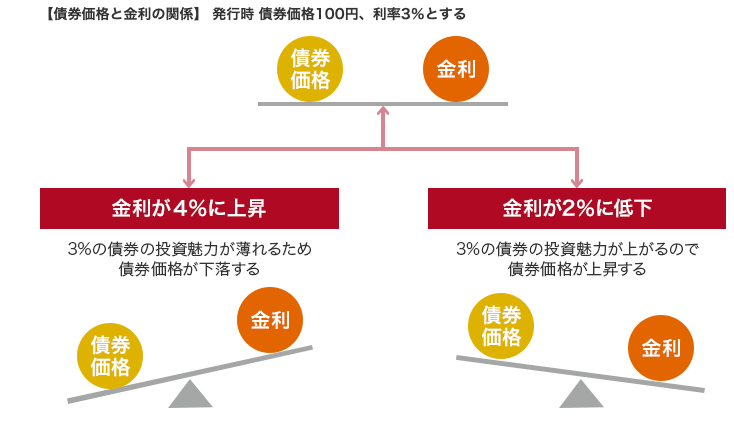 市場金利と債券価格は、シーソーのような動きをします。つまり、市場金利が上がると債券価格は下がり、市場金利が下がると債券価格は上がるのです。